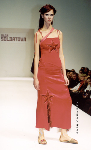 Рассказывать о коллекциях Ольги Солдатовой бессмысленно, это нужно видеть. В наше прагматичное время она рассказывает историю о людях, идущих по жизни под "Марш энтузиастов". Полосатые тенниски и войлочные тапочки; вечерние платья, украшенные вышитыми бисером самолетиками. Шорты из ткани с рисунками, изображающими героев первых пятилеток: "25 замесов в смену, 25 замесов в смену...".