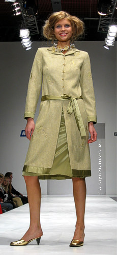 Избегать повторов Лене Стариковой удается достаточно успешно. Модели выглядели достойным результатом качественно и кропотливо проделанной работы. Характерная черта этой коллекции - отсутствие контрастов. Модельер делает акцент на цельность образа, тем самым подчеркивая гармоничность и мягкость женской души. При достаточно простой фактуре все модели выглядят изысканно: такой эффект достигается через использование приталенного и удлиненного силуэта. Длиннополые пиджаки, практически полное отсутствие мини - все это, с одной стороны, делает коллекцию приемлемой для деловых будней, а с другой - представляет женщину, предпочитающую одежду от Лены Стариковой, сдержанной и загадочной. Юбки от Лены Стариковой особенно женственны, именно поэтому о них стоит сказать отдельно. Наиболее часто встречающаяся длина - до колен или чуть ниже, силуэт - свободный. Последняя особенность коллекции - футуристский металлический оттенок. На мой взгляд коллекция удалась.